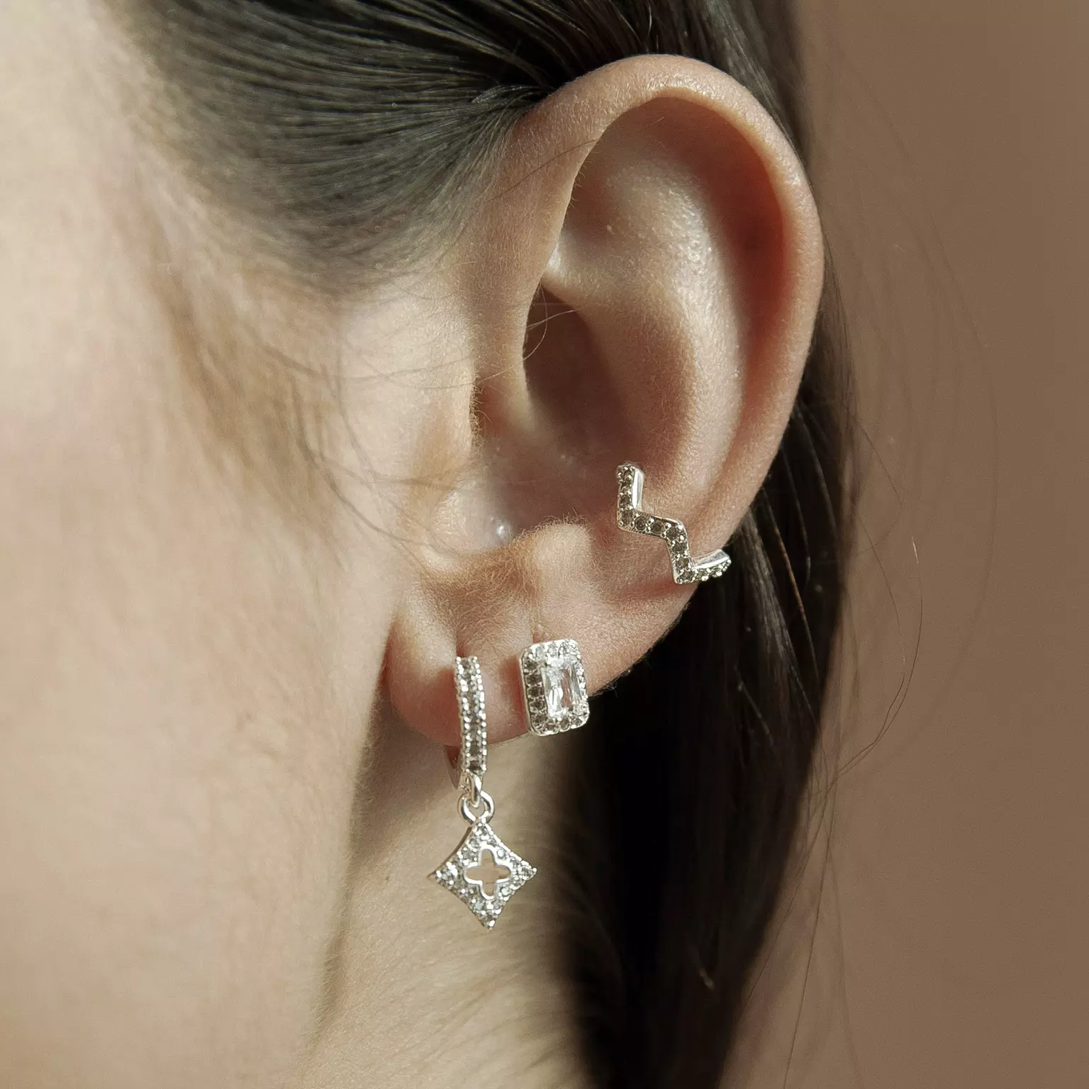 Brincos em formato retangular, com bordinha cravejada.