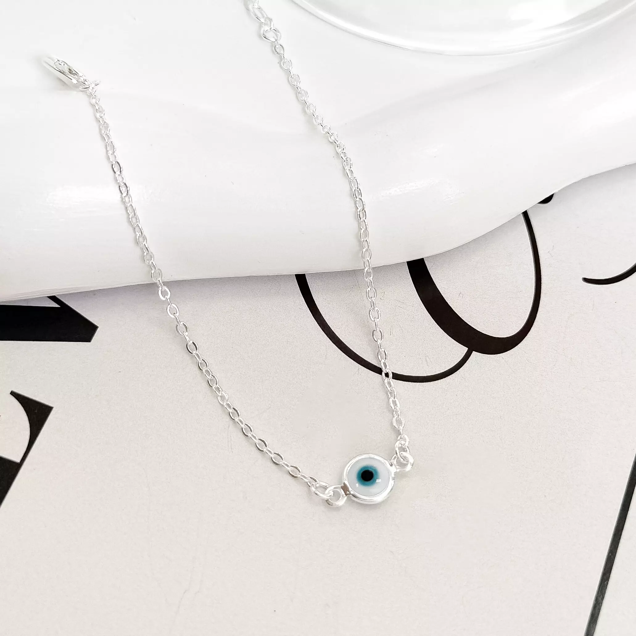 Pulseira, mini elos com pingente redondo de olho grego.